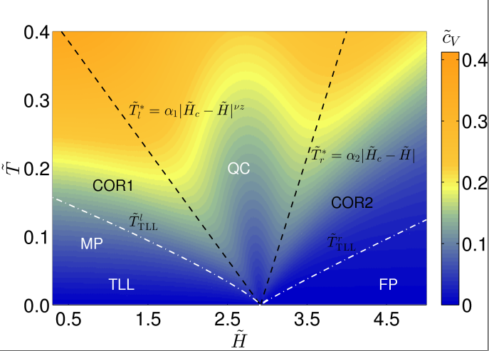 比热临界相图。QC代表量子临界区,TLL代表朝永-拉亭戈液体,COR是非相干拉亭戈液体区。在非相干拉亭戈液体区,电荷自由度是相干的,以声速传播,而自旋自由度变成自由的气体形式,不再具有声速。