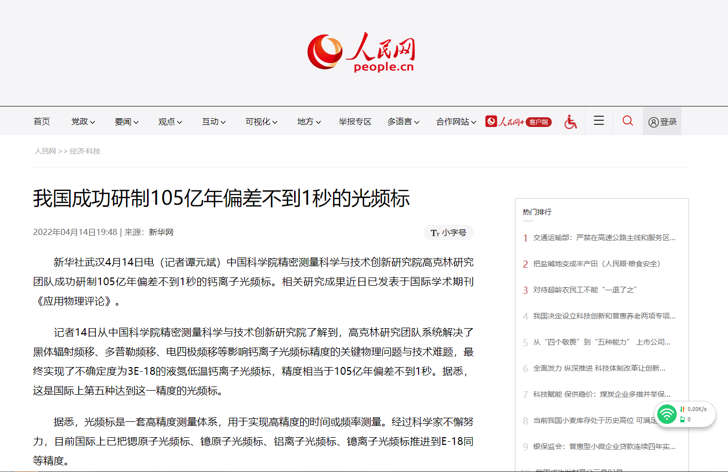 【人民网】我国成功研制105亿年偏差不到1秒的光频标