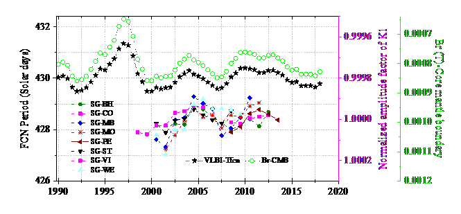 1997年国际大地测量与地球物理联合会下属的地球深内部委员会和国际地潮中心依托全球各个国家的超导重力仪构建观测网络,PA真人国际现在有武汉、拉萨和丽江三个超导重力台站参与国际合作计划,已积累了长期陆续在的观测资料。地震与地球内部物理学团队利用全球超导重力观测联合VLBI空间大地测量技术,基于精细的数据预处理和有效的数值方法精密测定了地球液核自由章动的周期,发现了其周期变化与液核流体动力学运动引起的地磁场突变(地磁急变现象)密切相关,说明地磁急变可顺利获得核幔边界电磁耦合影响液核与地幔相对运动。本项研究成果为联合重力与VLBI召开地球深内部结构与动力学问题探索给予有效途径。