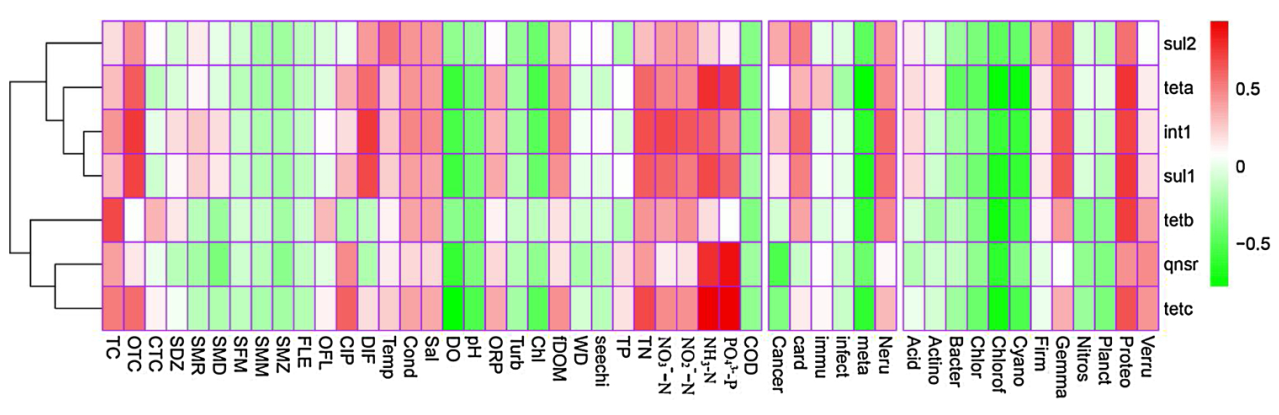洪湖及周边水域抗生素抗性基因与微生物群落、环境因子的相关性热图
