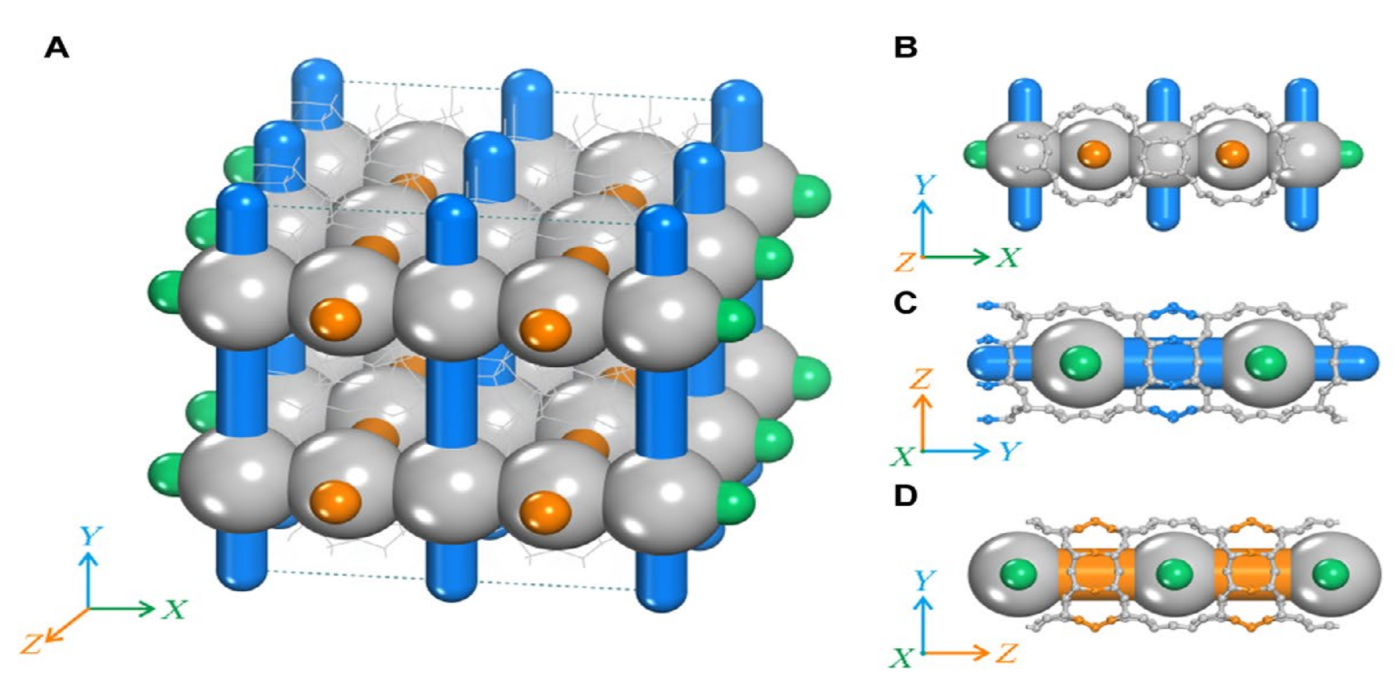 郑安民研究员带领的科研团队长期致力于分子筛限域孔道中吸附和扩散行为的实验和理论研究,在前期工作中建立了沸石分子筛限域孔道结构及碰撞对扩散系数的定量关联(J. Catal. 2019, 377, 51; AIChE, 2020, e16269.),阐明了吸附和扩散对甲醇制烯烃(J. Phys. Chem. C, 2017, 121, 22872.)以及羰基化反应(J. Catal. 2019, 369, 335.)影响的微观机制。在此基础上,该团队顺利获得大规模高通量筛选,发现具有陆续在性交叉孔结构的SCM-15分子筛在高浓度下依旧保持较高的扩散性能。基于分子动力学模拟,发现陆续在交叉孔与传统交叉孔(非陆续在)的性质存在非常大的差异,该类孔道结构具有较弱的吸附能和非常低的扩散能垒:低浓度情况下,分子主要沿着具有强吸附位点的非陆续在交叉孔方向扩散,因此扩散系数较小;随着浓度增加,分子逐渐吸附到具有较低扩散能垒的陆续在交叉孔方向,因此在高浓度依旧能够保持良好的扩散性能。本工作首次提出陆续在交叉孔结构,并揭示了该结构能够促进高浓度快速扩散的微观机理。为工业催化剂的合成、选择与提高分子筛寿命给予借鉴和指导。