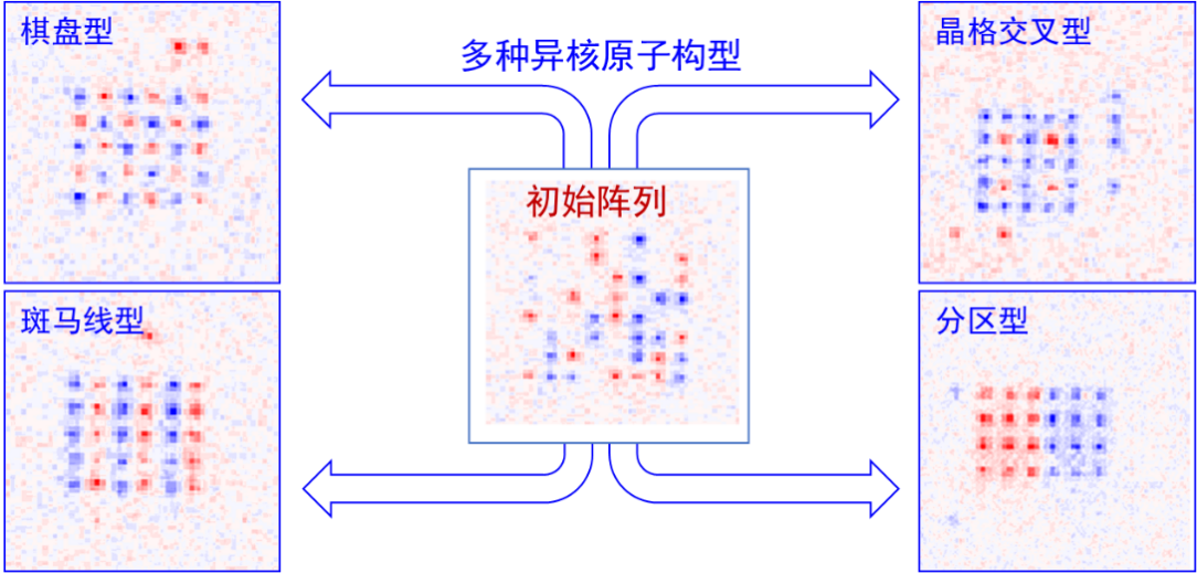 但国际上无缺陷异核原子阵列尚未见报道过,这其中的挑战在于异核单原子的装载和重排中对错位原子的处理。詹明生研究团队在研究员何晓东、许鹏攻关下,顺利获得精确调控激光的失谐和功率解决了两种原子均匀装载的问题,并开展了集团启发算法结合优先级标定的算法有效地排列了错位的原子,实现了15个87Rb加15个85Rb的异核单原子阵列。研究团队演示了该算法对不同二维原子阵列排列的有效性,展示了棋盘型、晶格交叉型、斑马线型等多种构型原子阵列。至此,结合团队前期在异核原子量子纠缠(Phys. Rev. Lett. 119, 160502 (2017))、魔幻光阱异核原子均衡相干时间(Phys. Rev. Lett.124, 153201 (2020))和异核原子相干形成单分子(Science 370, 331–335 (2020) )等方面完成的系列工作,该研究团队已经成功创建了独具特色的双组份单原子阵列平台,未来有望基于该多体量子平台在量子计算、量子模拟、单分子阵列、精密测量、多体物理等方面的研究中取得突出的进展。