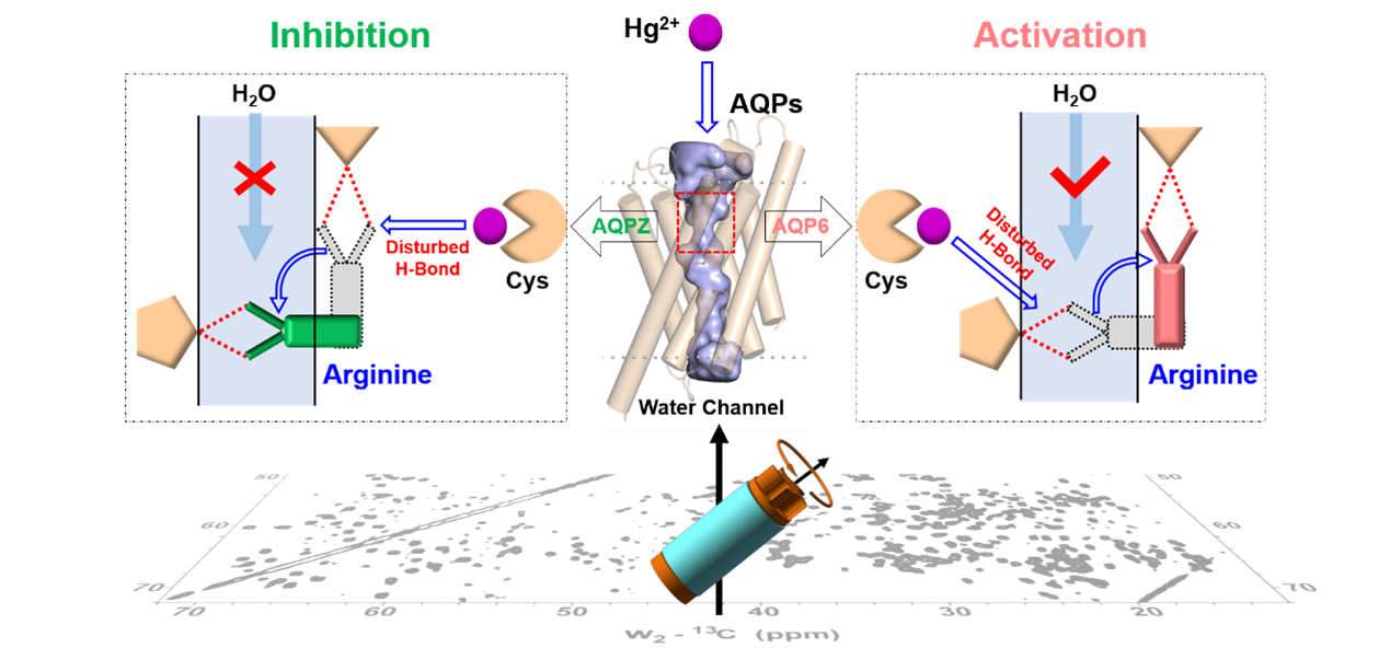 AQP是一类广泛存在于动物、植物与微生物中不可或缺的膜通道蛋白。AQP与人体的许多生理过程密切相关,其功能的异常可能导致人类严重的疾病。AQP功能调节剂在水肿、癌症、肥胖、脑损伤、青光眼等疾病中具有治疗潜力。汞离子对AQP功能具有调控作用,既能抑制AQP的通水速率,又能激活AQP的通水速率。然而到现在为止,人们对汞离子相反调控AQP功能的分子机制仍然知之甚少,阻碍了AQP功能调节剂的设计和开发。