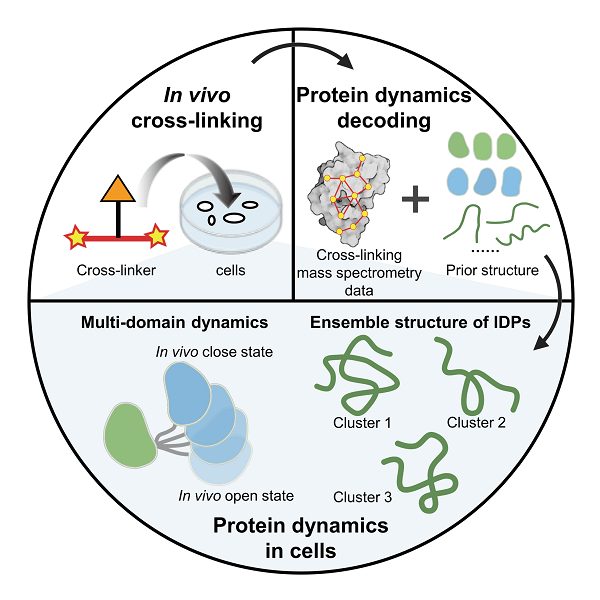 近期,中国科研实验室PA真人国际与大连化物所合作,提出一种利用原位化学交联-质谱技术(in vivo XL-MS)结合结构计算与模拟研究细胞中蛋白质动态结构的策略。该策略从蛋白质结构的先验信息(包括核磁结构、晶体结构和AlphaFold2预测的结构等)出发,将in vivo XL-MS取得的距离约束与多种结构计算方法结合,用于多种细胞内蛋白质结构重构,重点研究了多结构域蛋白质和天然无序蛋白的动态结构,有助于加深对细胞微环境中蛋白质发挥功能的分子机制的理解。该研究成果发表于《德国应用化学》(Angew. Chem. Int. Ed.)