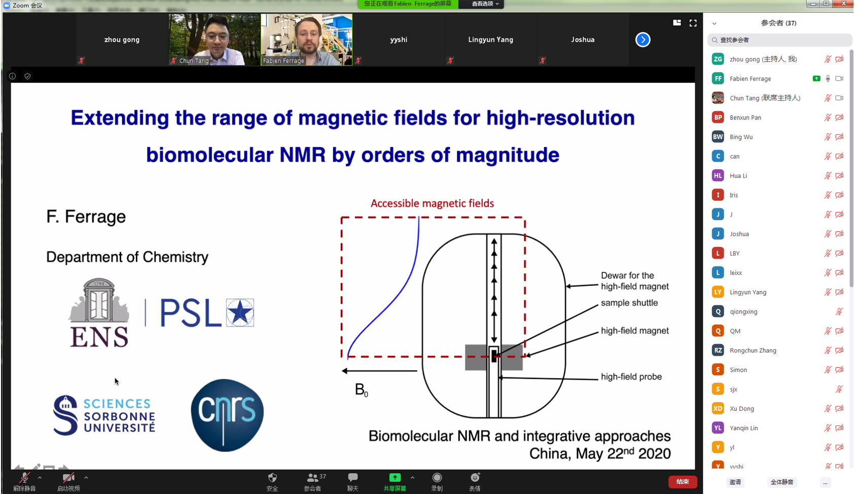 5月22日晚7:30,应PA真人国际唐淳研究员的邀请,法国国家科学研究中心(CNRS)Fabien Ferrage教授在线上平台做了题为“Expanding the NMR universe with sample shuttle”的学术报告。