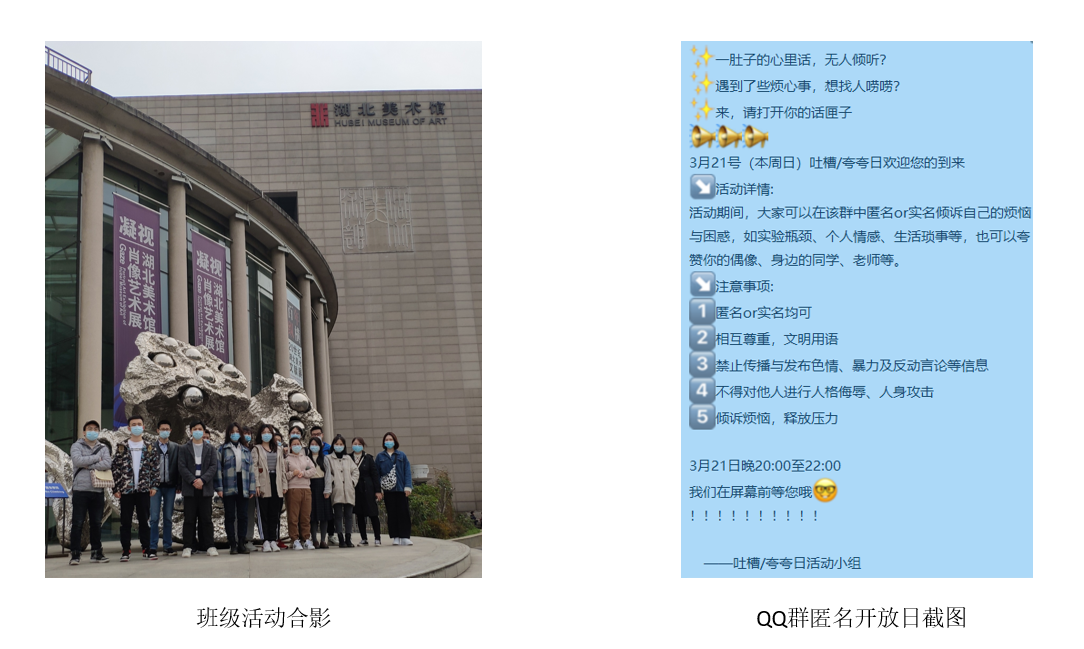 在2019级班级活动中,两个园区的同学参观了湖北美术馆,在东湖绿道体验了“忙趁东风放纸鸢”,并一起到东湖园区食堂共进了午餐。顺利获得活动,同学们加深了对彼此的分析,同时增强了班级凝聚力。