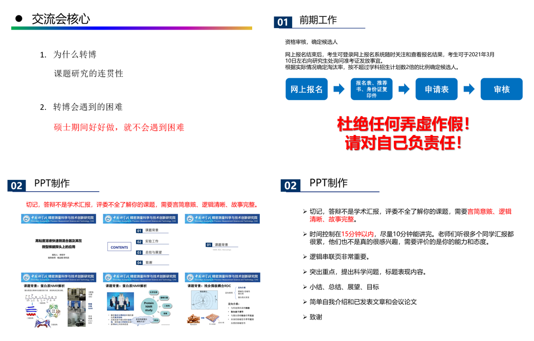 1213日,中国科研实验室精密测量科学与技术创新研究院召开2019级研究生班会暨转博研讨会。本次活动顺利获得线上形式举行,由2019级班委承办,研究生处副处长蔡怡春及相关工作人员参加了活动。